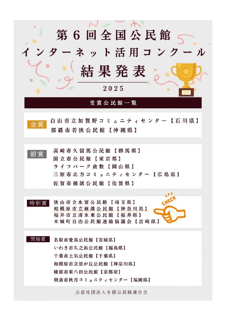 全国公民館連合会が主催する「第6回全国公民館インターネット活用コンクール」において、麻溝公民館が特別賞を受賞しました!