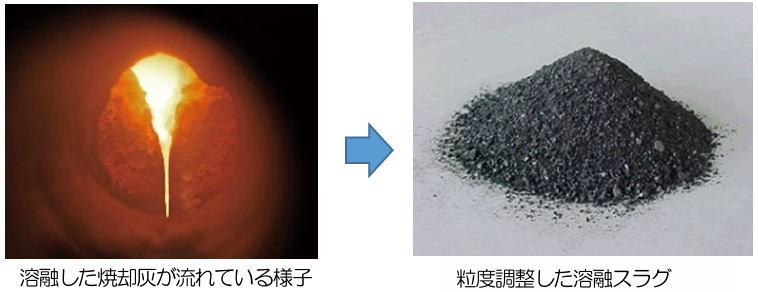 | ゴミは燃やして灰になったあと、再び高温で熱しドロドロにして水で固め粉砕→スラグ |