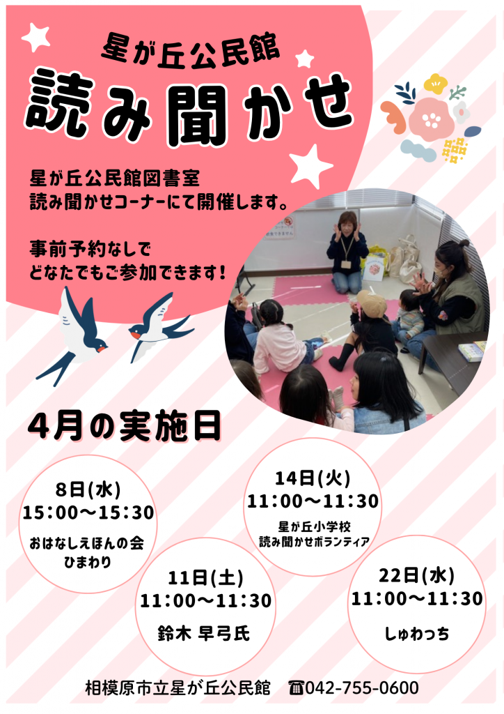 令和6年11月から星が丘公民館図書室の「読み聞かせコーナー」で、毎月4回程度、絵本の読み聞かせを開催しています。ぜひお越しください。