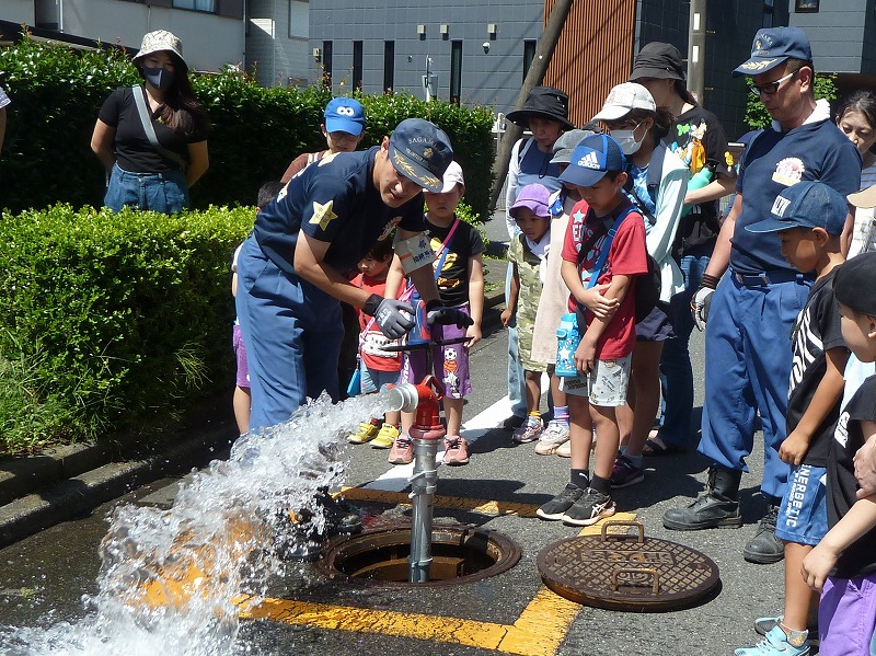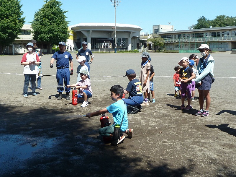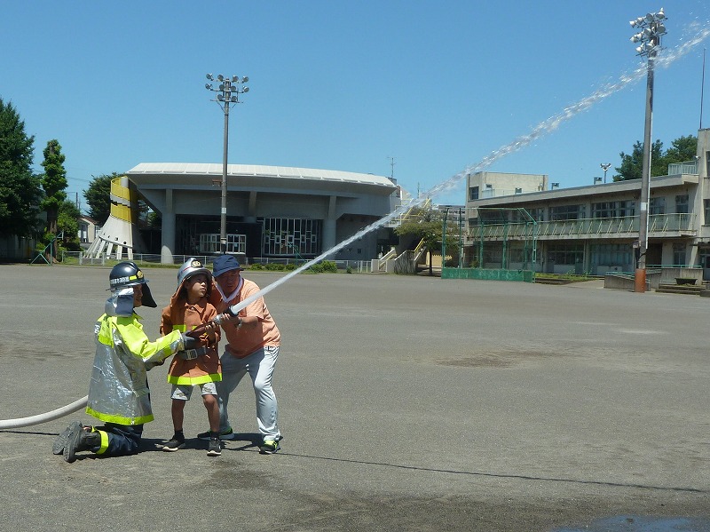 消防団員の方から消火器の使い方や放水体験の指導を受けました。暑い中、子どもたちも真剣に話を聞き、放水体験ではホースの重さに驚きながら、団員の皆さんへ感謝の言葉を伝えていました。