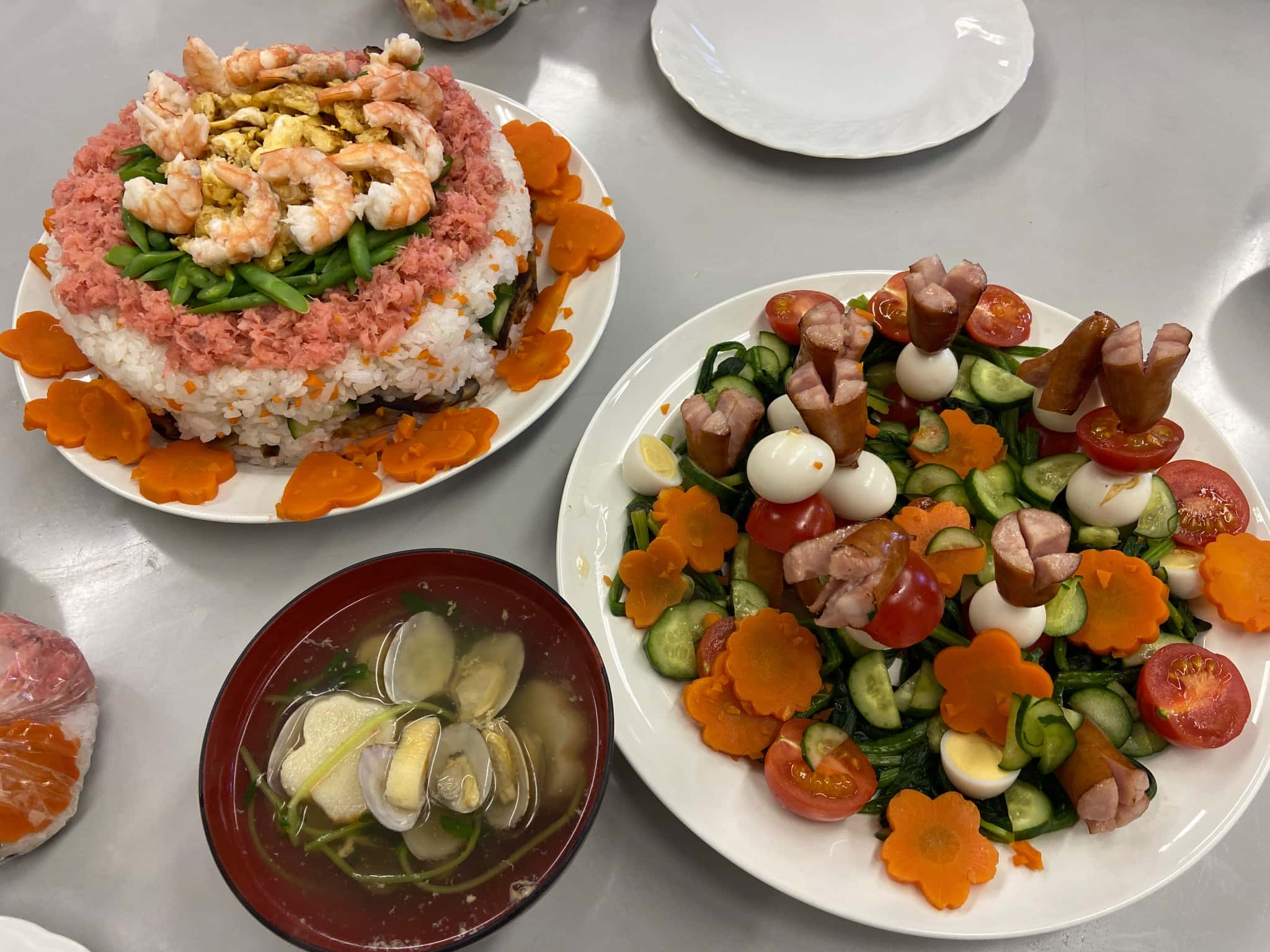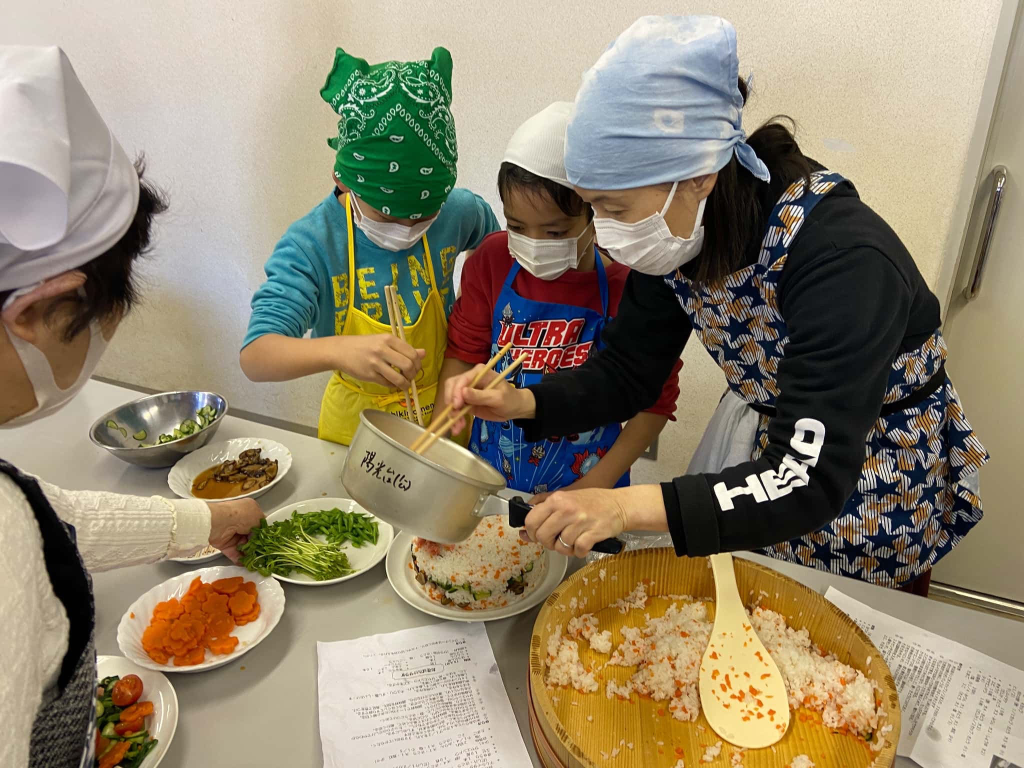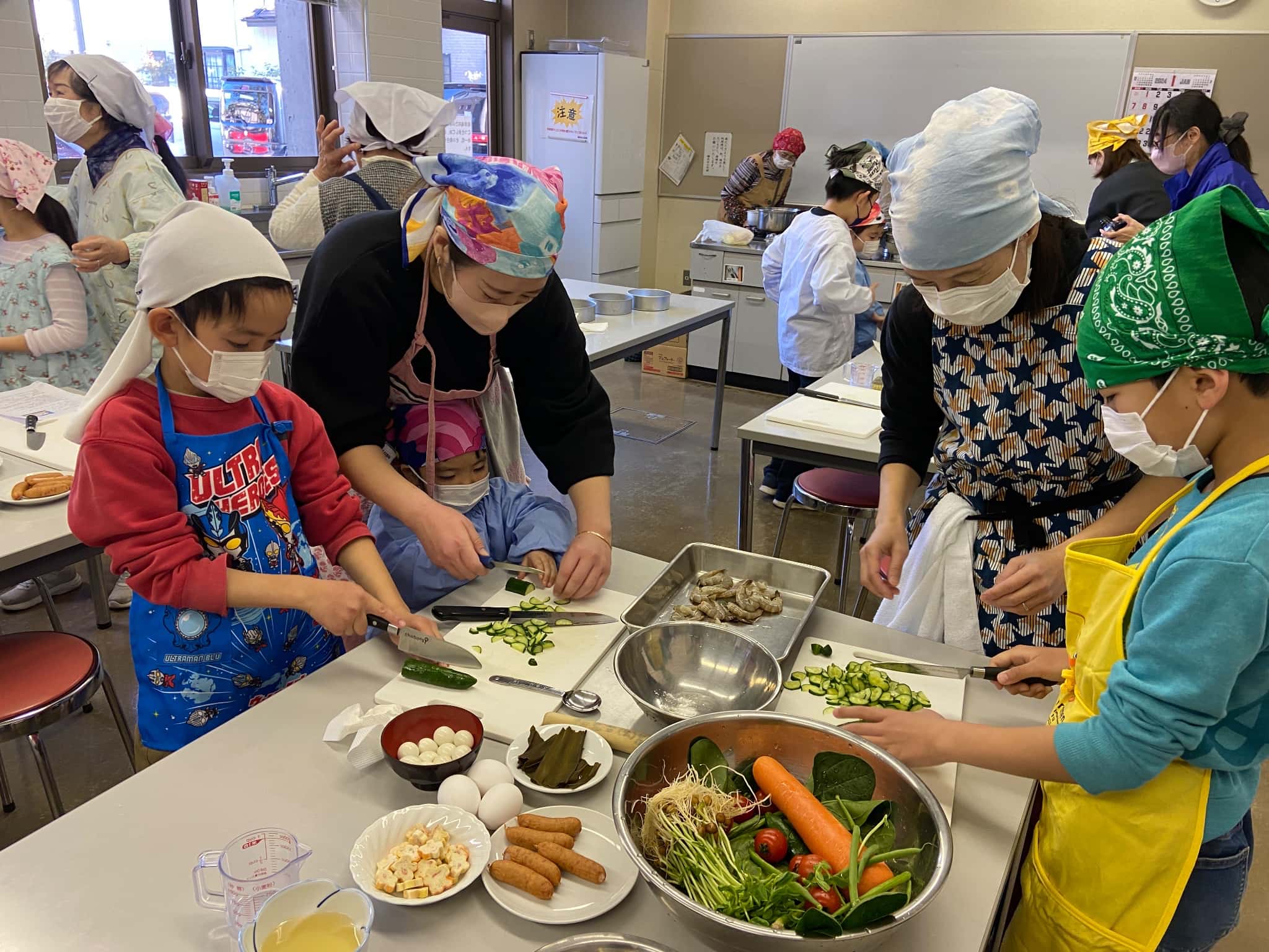 隣接地区の陽光台公民館を拠点としている松葉町婦人会の皆さんとちらし寿司を作りました。子どもたちは「次は何をすればいい?」「僕にもやらせて!」と、とても積極的。桜でんぶを手作りしたことも感激です。料理を通してたくさんの絆がうまれました。