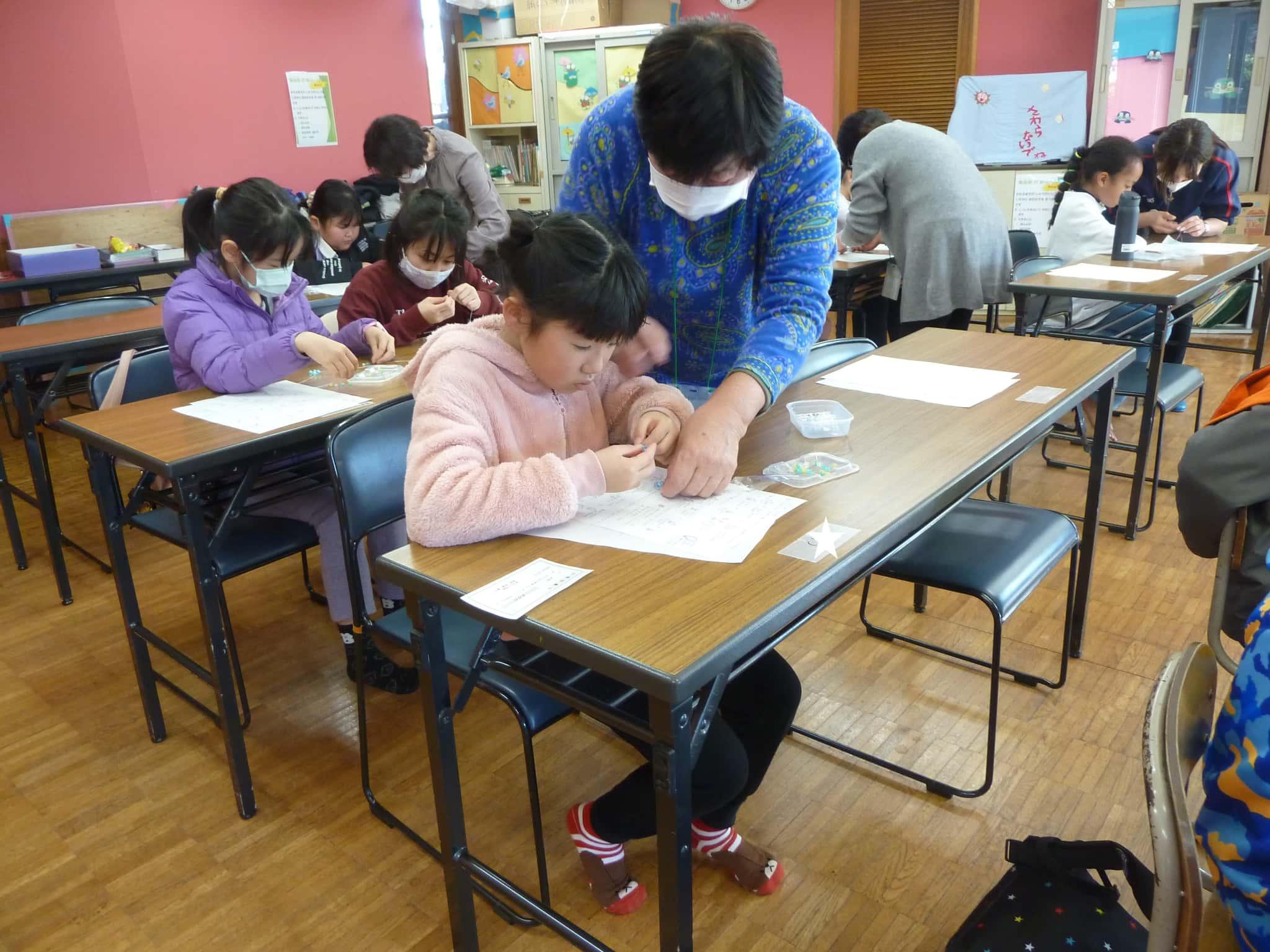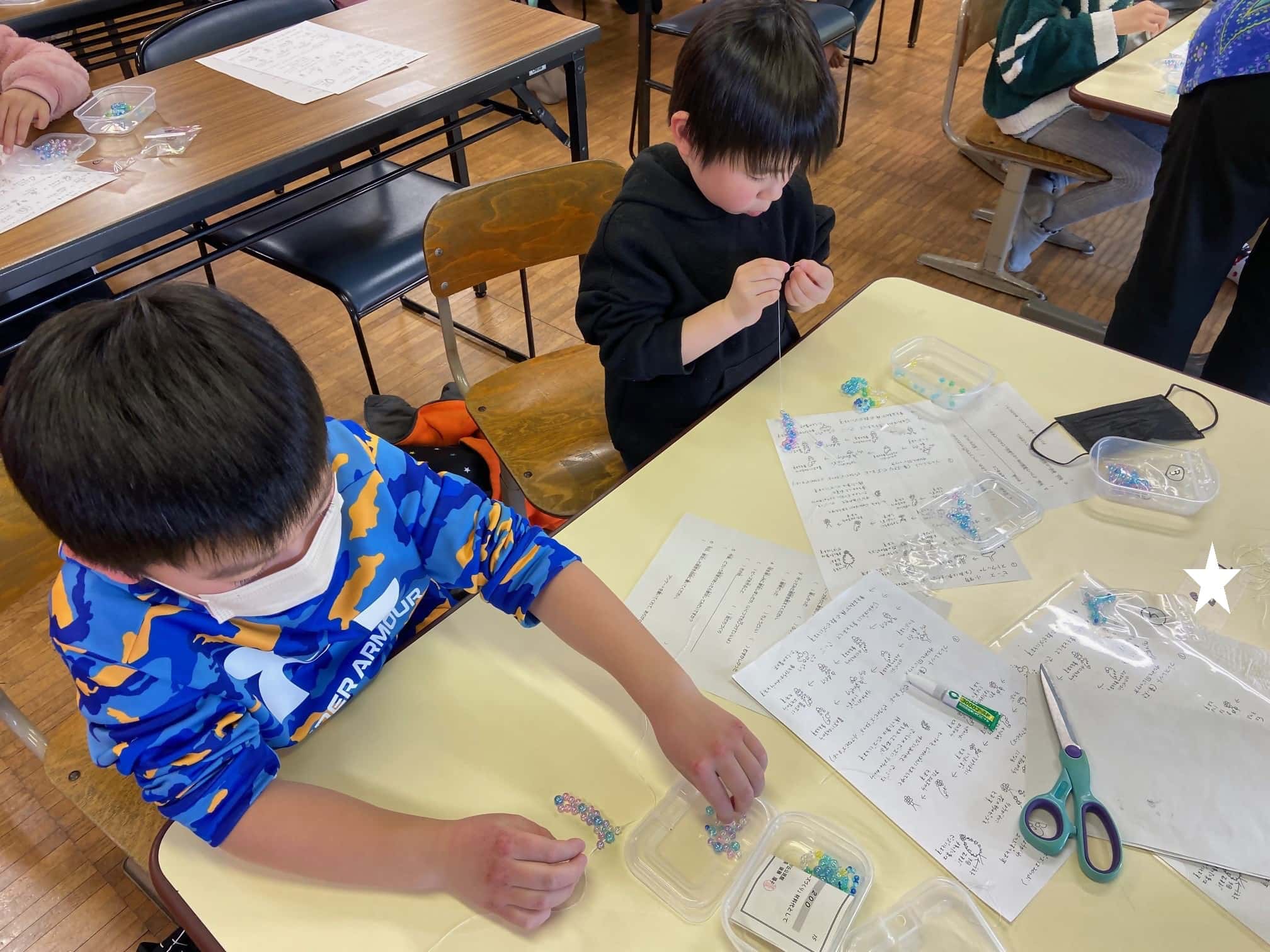 子どもゆめ教室「ビーズづくり教室」を行いました。子どもたちは真剣に、ブレスレットや指輪を作っていました。地域の方のサポートで、とてもステキな作品が完成しました。集中しすぎて、少し疲れたかな。参加してくれてありがとう!