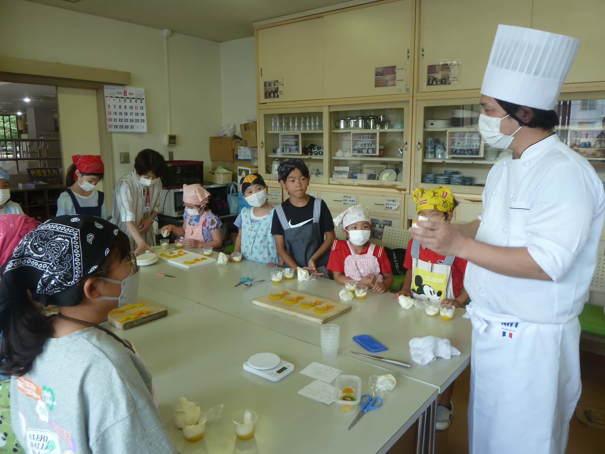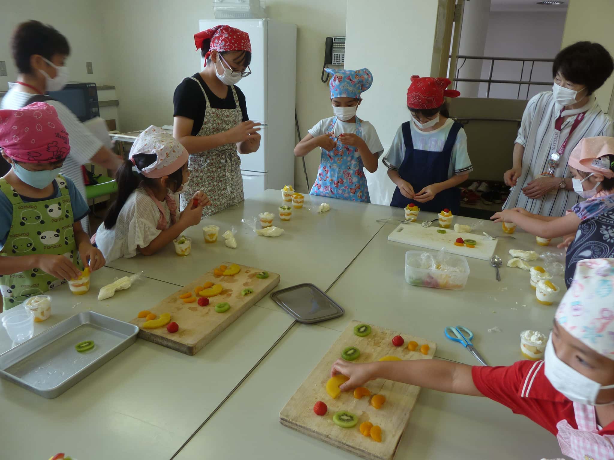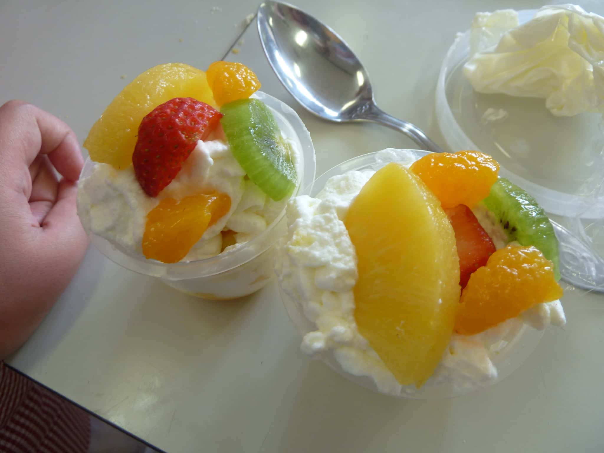 ミニフルーツパフェづくりをしました。講師は地域のケーキ屋「花みずき」さん。みかんゼリーと生クリーム、フルーツを盛り付け、かわいいミニパフェが完成しました。計量に少し苦戦しながらも、どれもおいしそうな仕上がりでした。