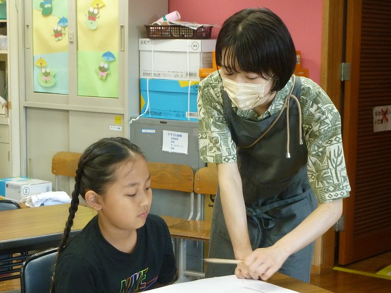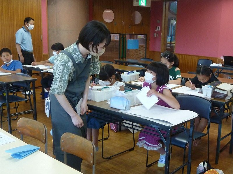 講師の松崎さんから、見やすい色使いや文字を目立たせる工夫などの助言を受けました。参加した子どもたちは「コツがつかめた」「楽しかった」と熱心に取り組んでいました。入賞作品が出るといいですね。