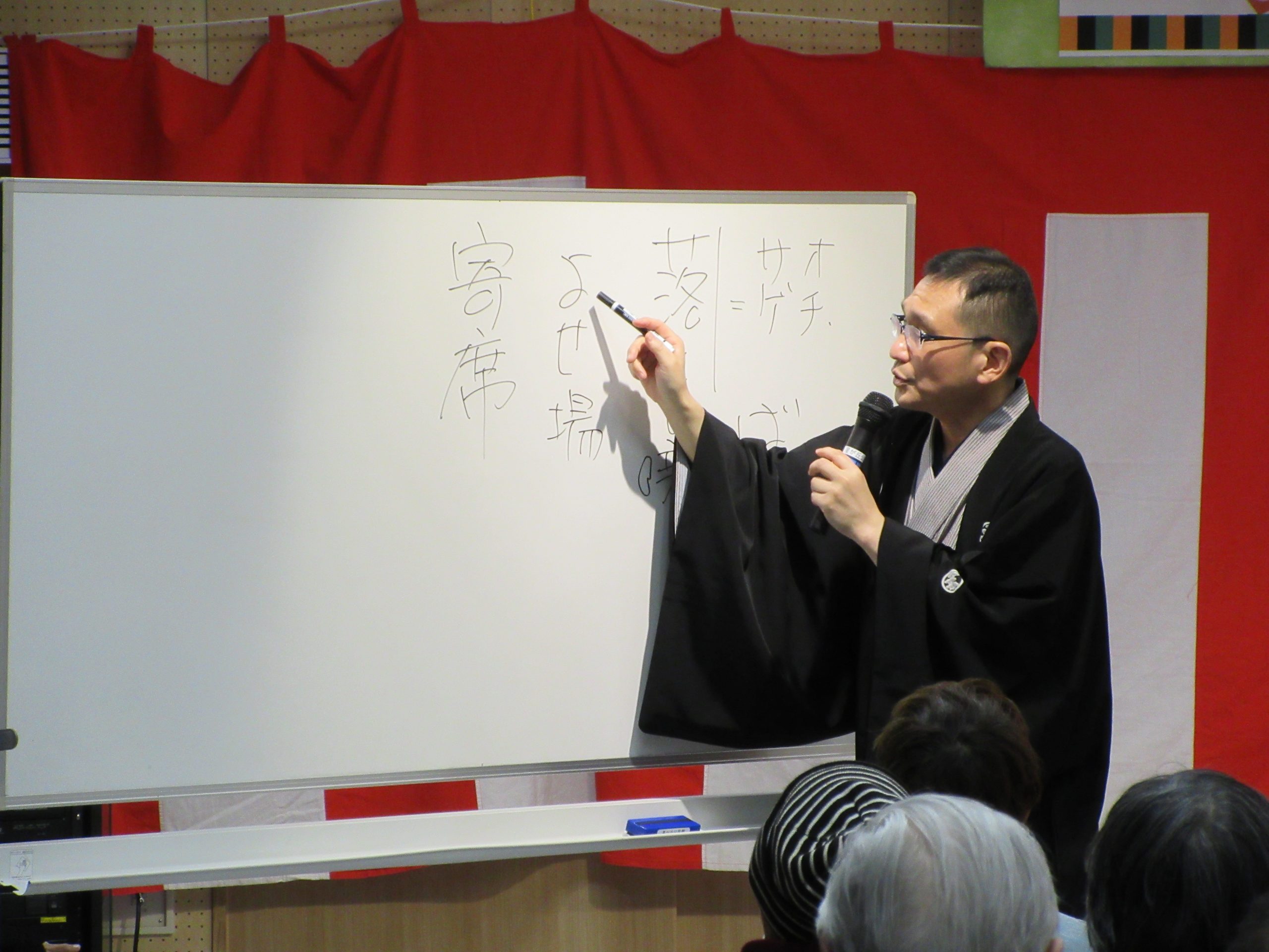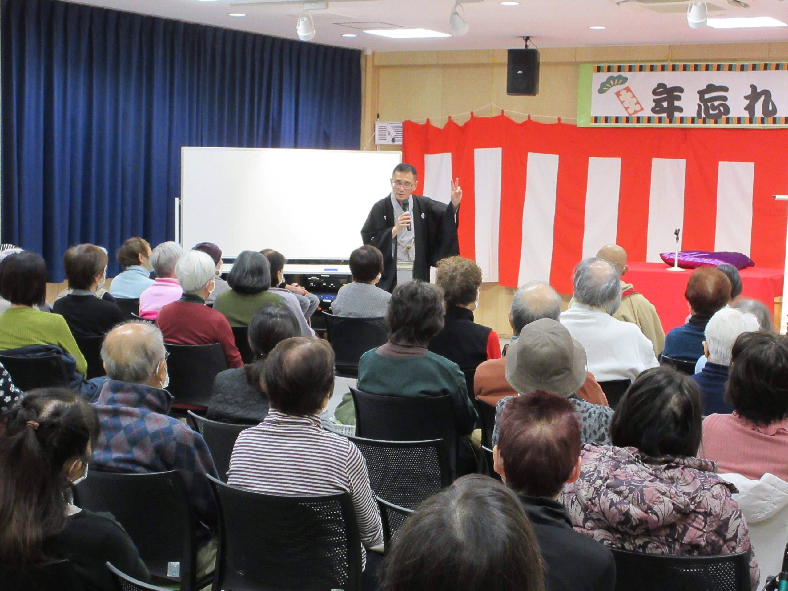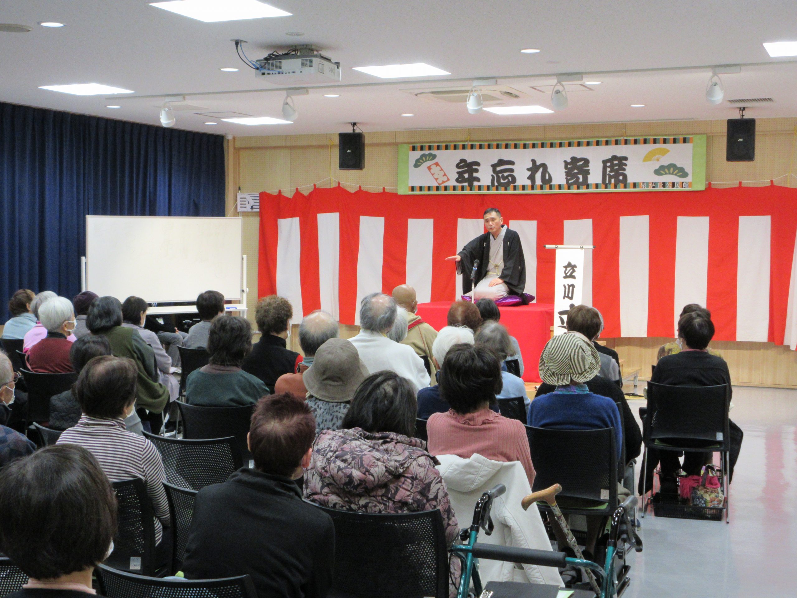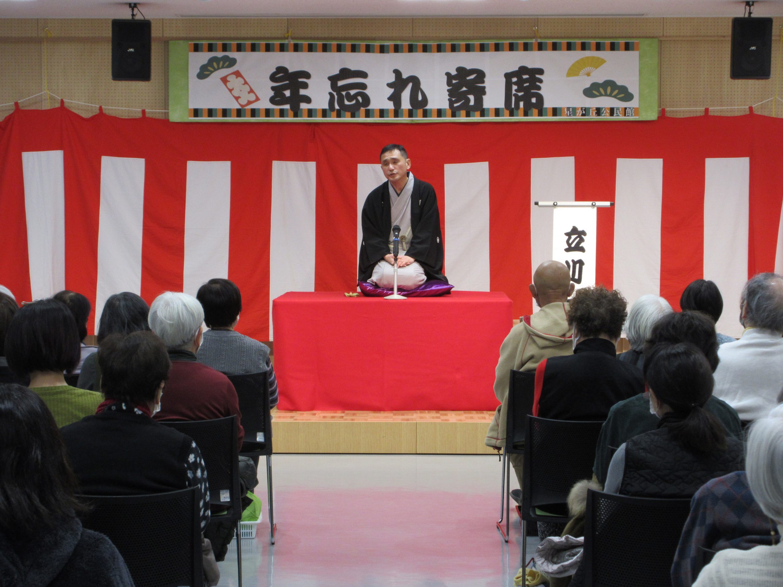 さがみはら若手落語家選手権優勝者の立川寸志氏をお迎えして年忘れ寄席を開催しました。落語の歴史から解説していただき、その後演目として「片棒」と「妾馬」を披露していただきました。参加者からはまた来てほしいとの声が多数上がっていました。