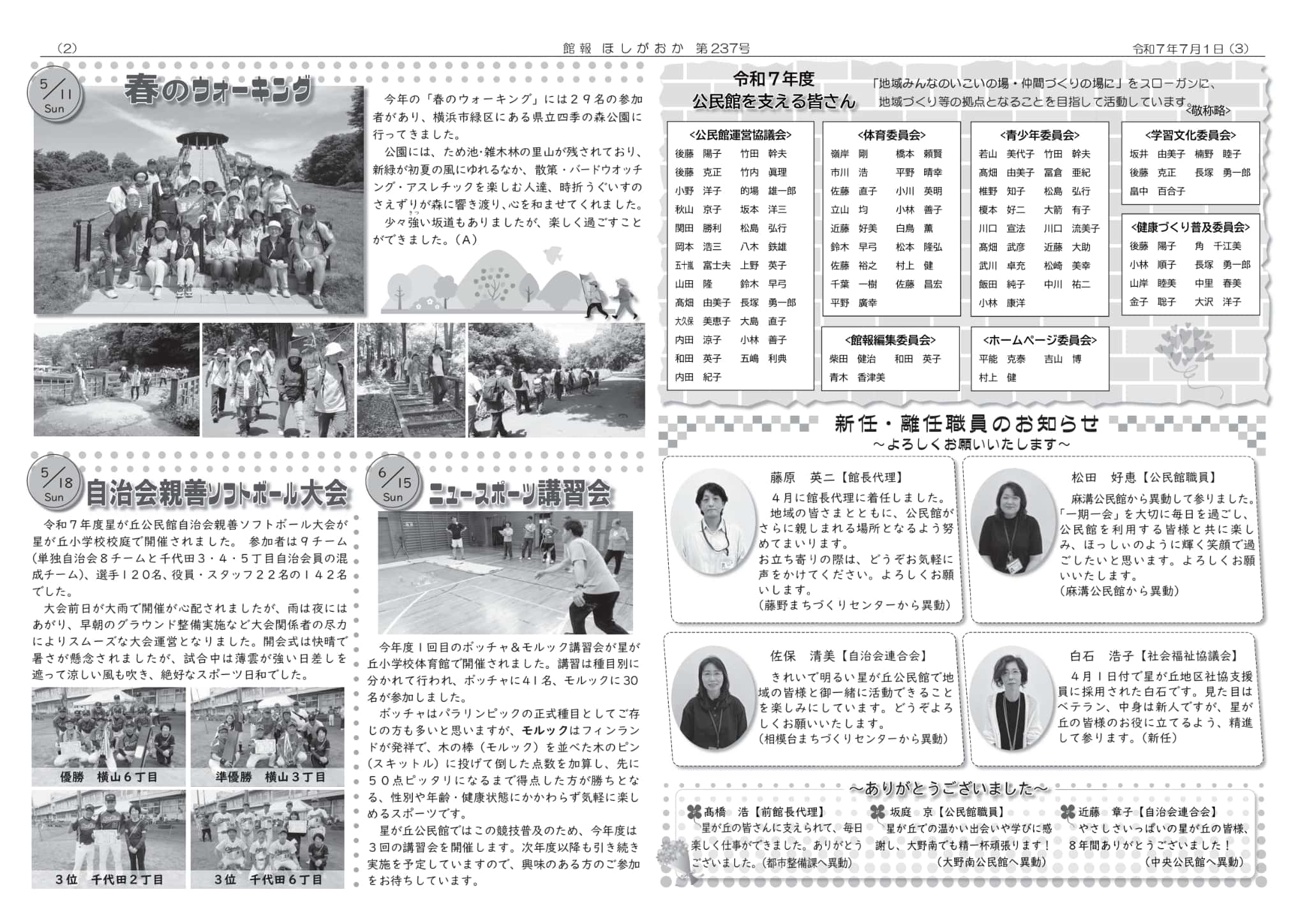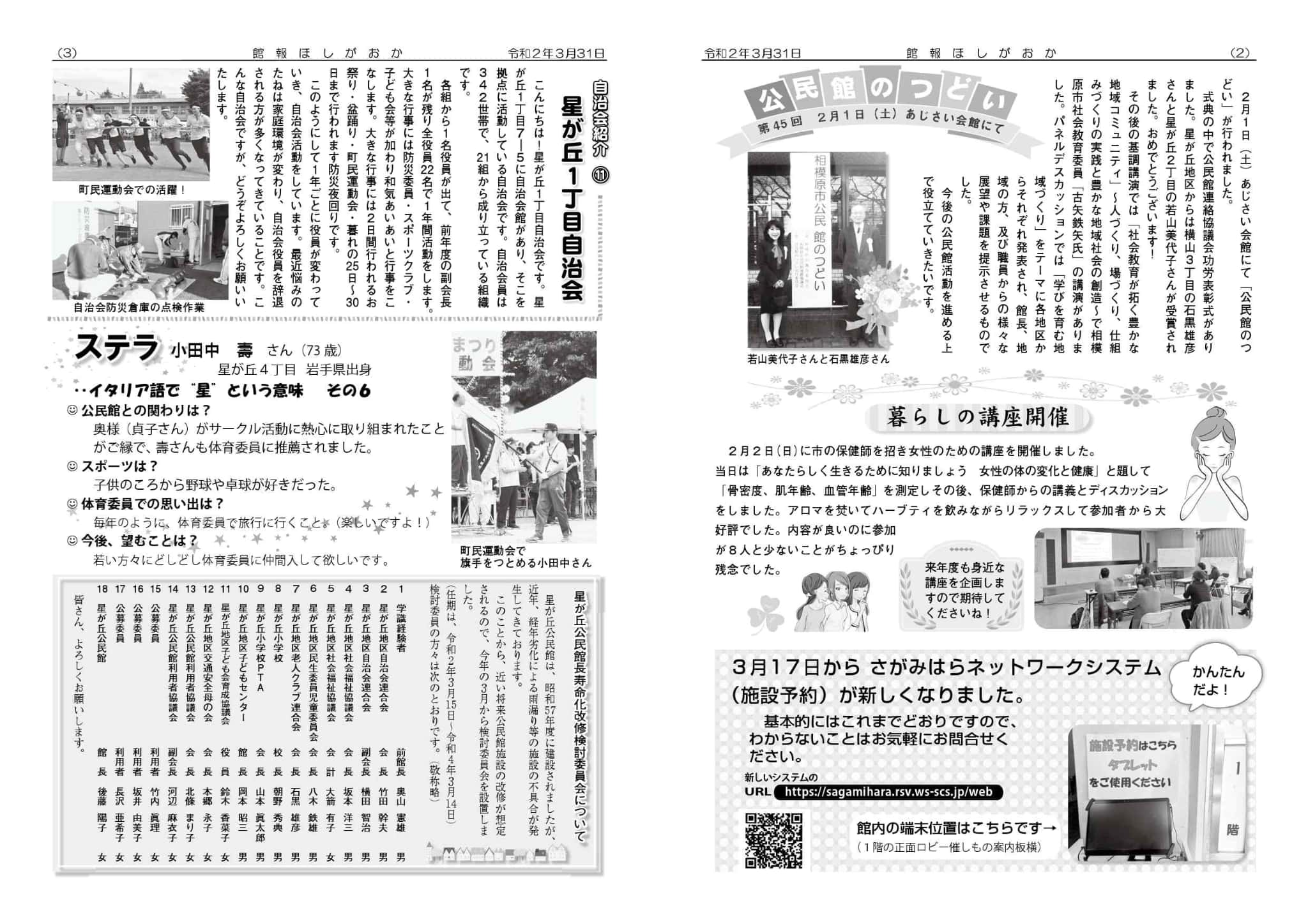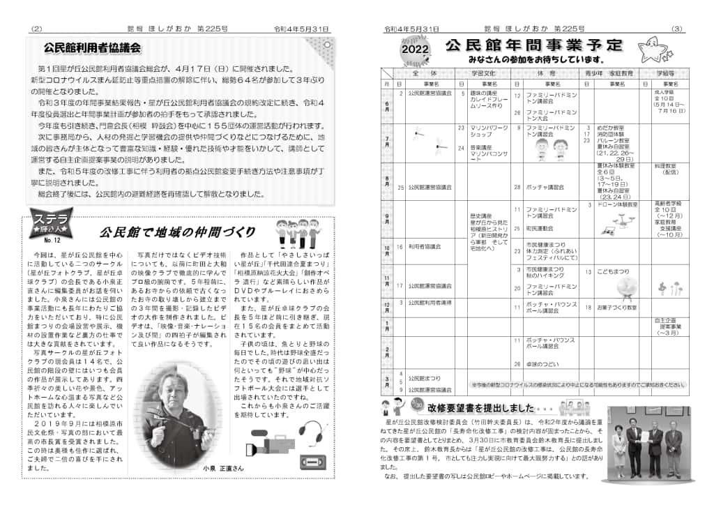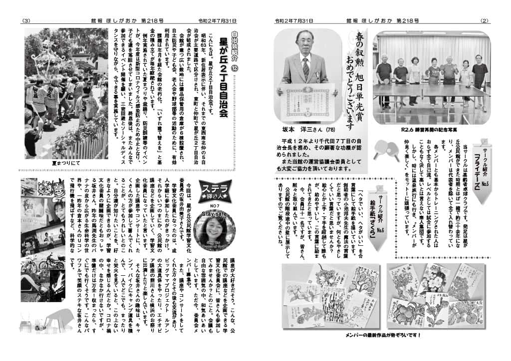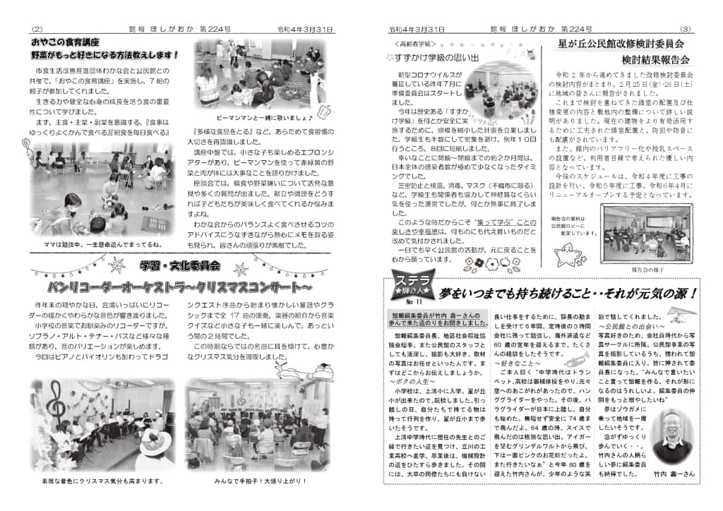 | ・お待たせしました!公民館再会です!! コロナ禍に負けない星が丘を目指そう ・春の叙勲旭日単光賞おめでとうございます ・公民館の職員紹介 ・公民館を支える人々 | |||