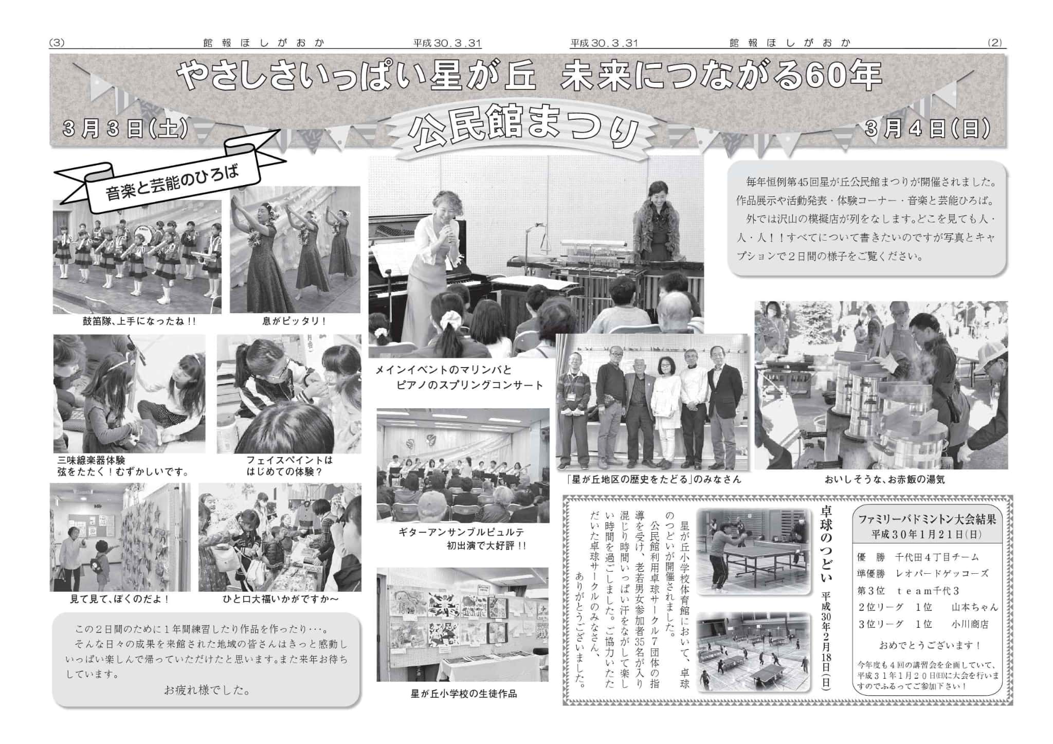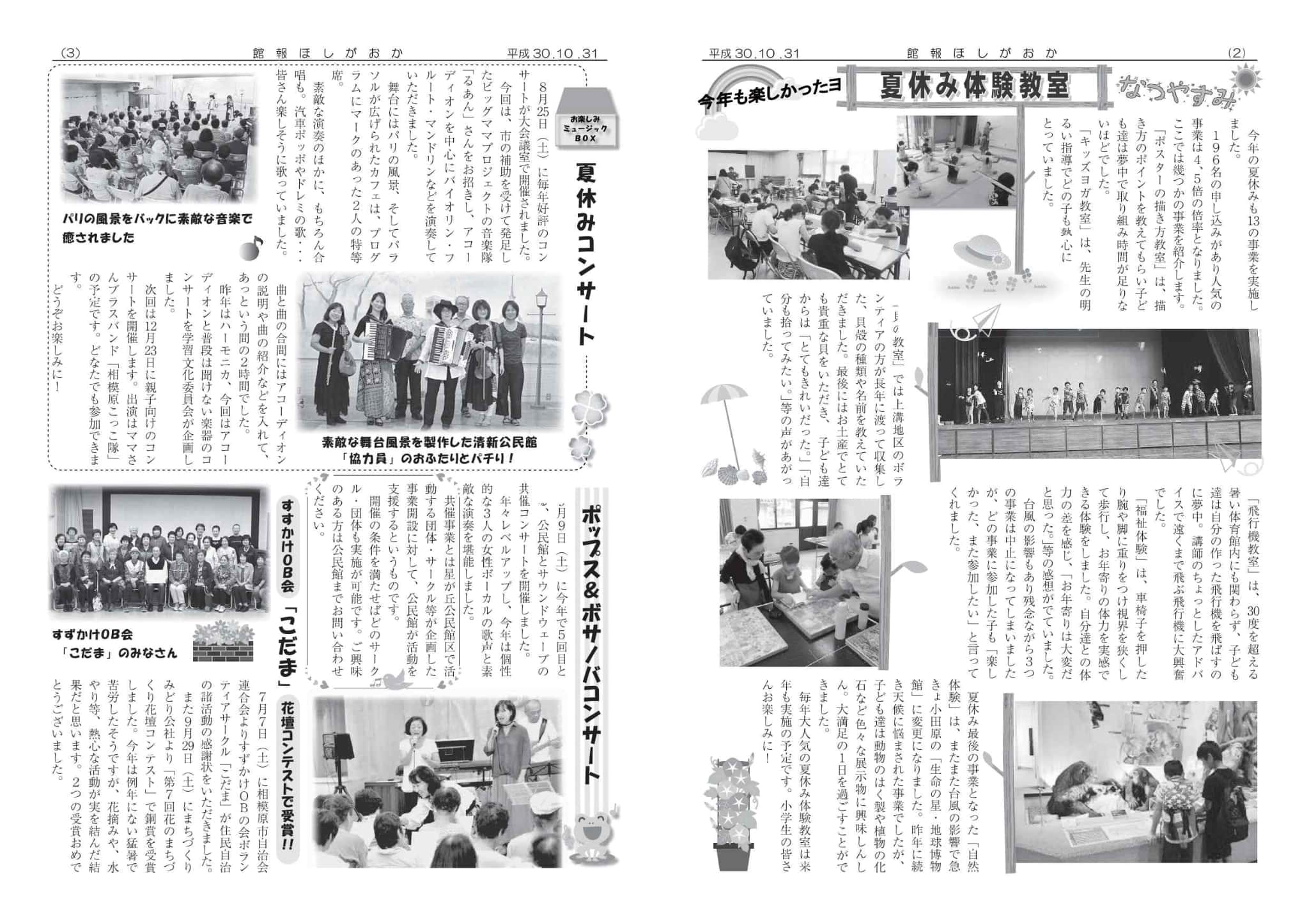 | ・第50回星が丘公民館まつり ・事業結果報告 「文学講座 大佛次郎」 「秋のハイキング」「体力測定」 「ボッチャ大会」 「歴史講座 星が丘から見た相模原ヒストリア」 「星空観望会」「子どもまつり」 ・参加者募集 | |||