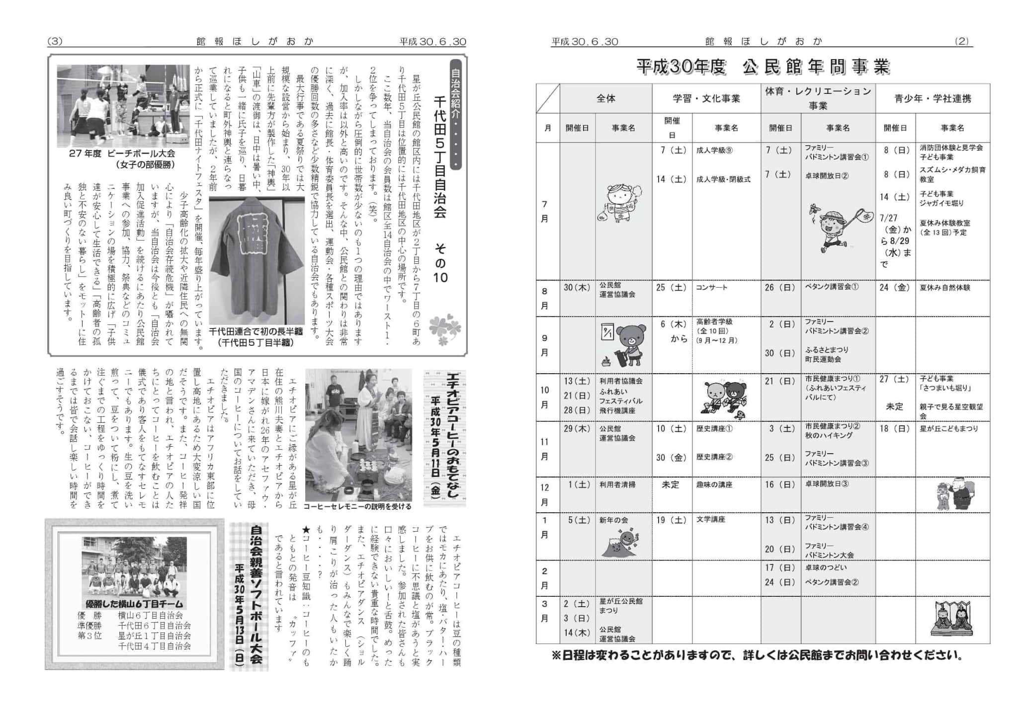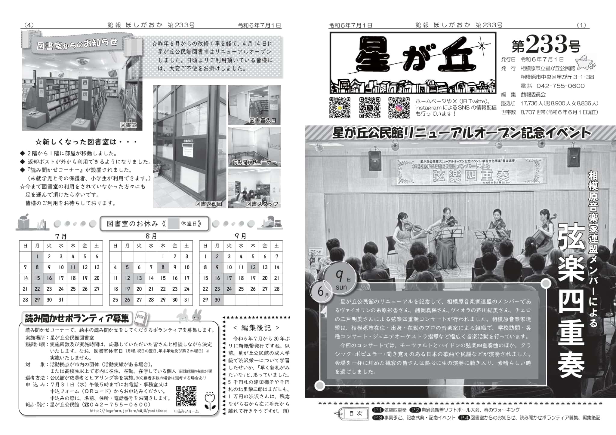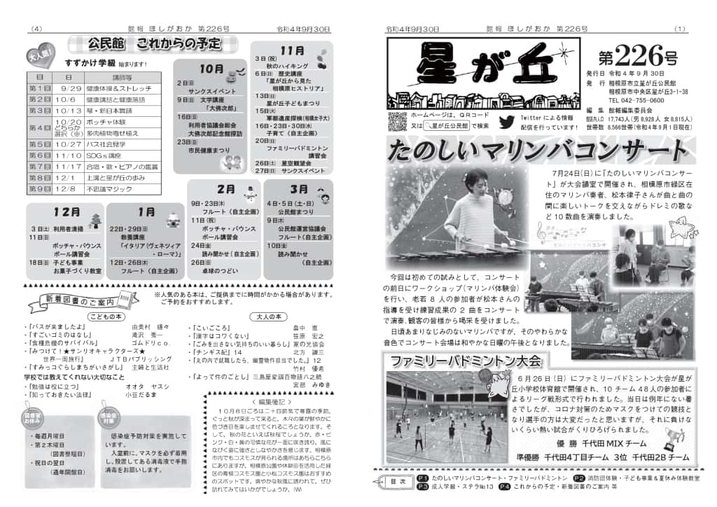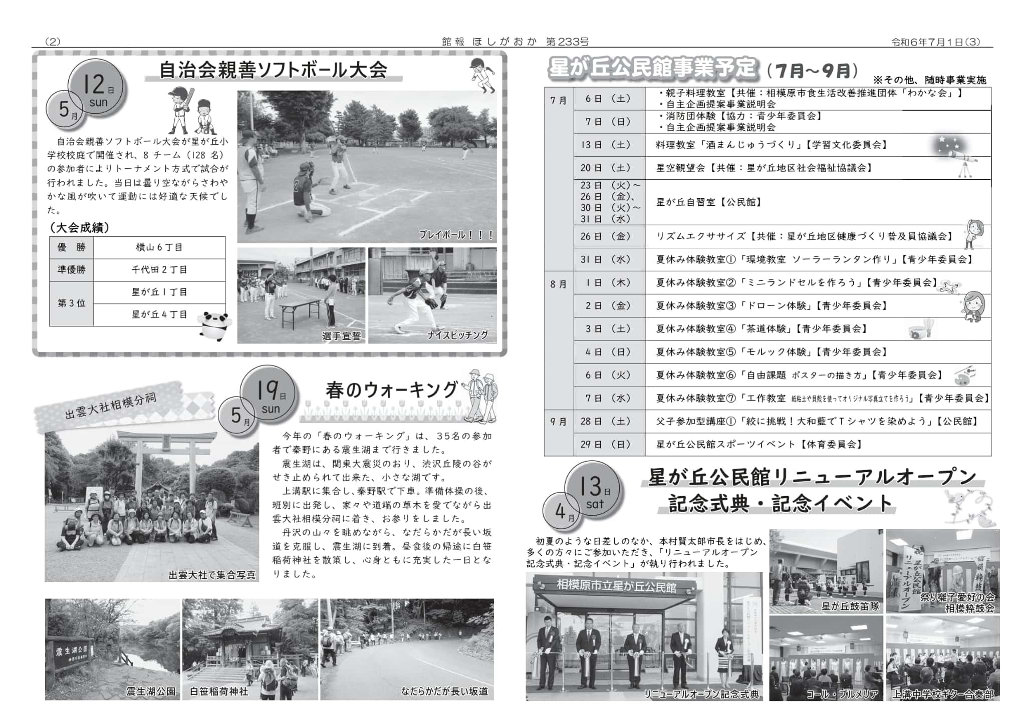 | ・事業結果報告 「弦楽四重奏」 「自治会親睦ソフトボール大会」 「春のウォーキング」 ・星が丘公民館事業予定(7月~9月) ・星が丘公民館リニューアルオープン記念式典・記念事業 ・図書室からのお知らせ ・図書室のお休み ・読み聞かせボランティア募集 ・編集後記 | |||