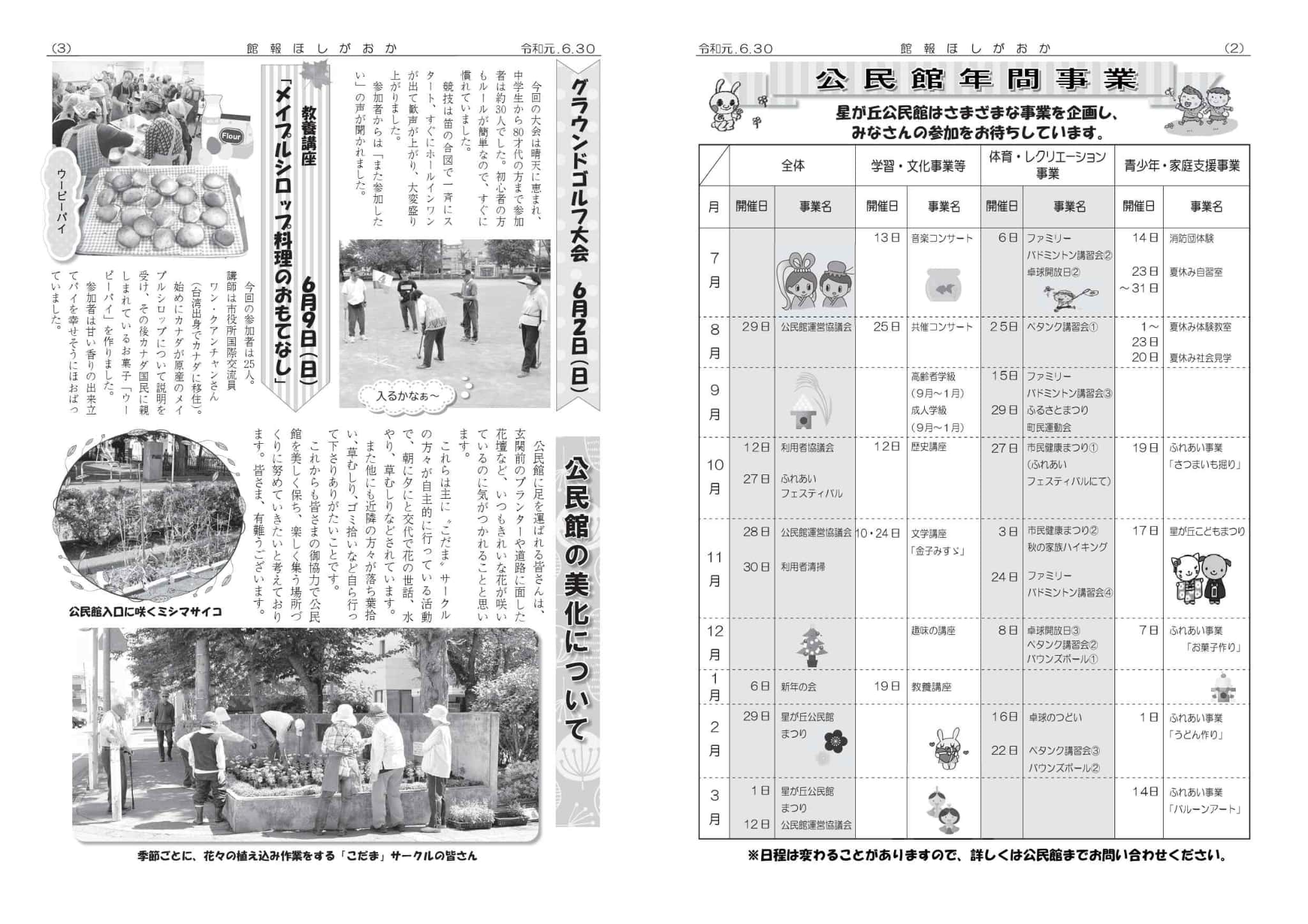 | ・自治会親善ソフトボール大会 ・公民館年間事業 ・グランドゴルフ大会 ・教養講座 「メイプルシロップ料理のおもてなし」 ・公民館の美化について ・公民館の事務室紹介 ・図書館システムが更新 | |||