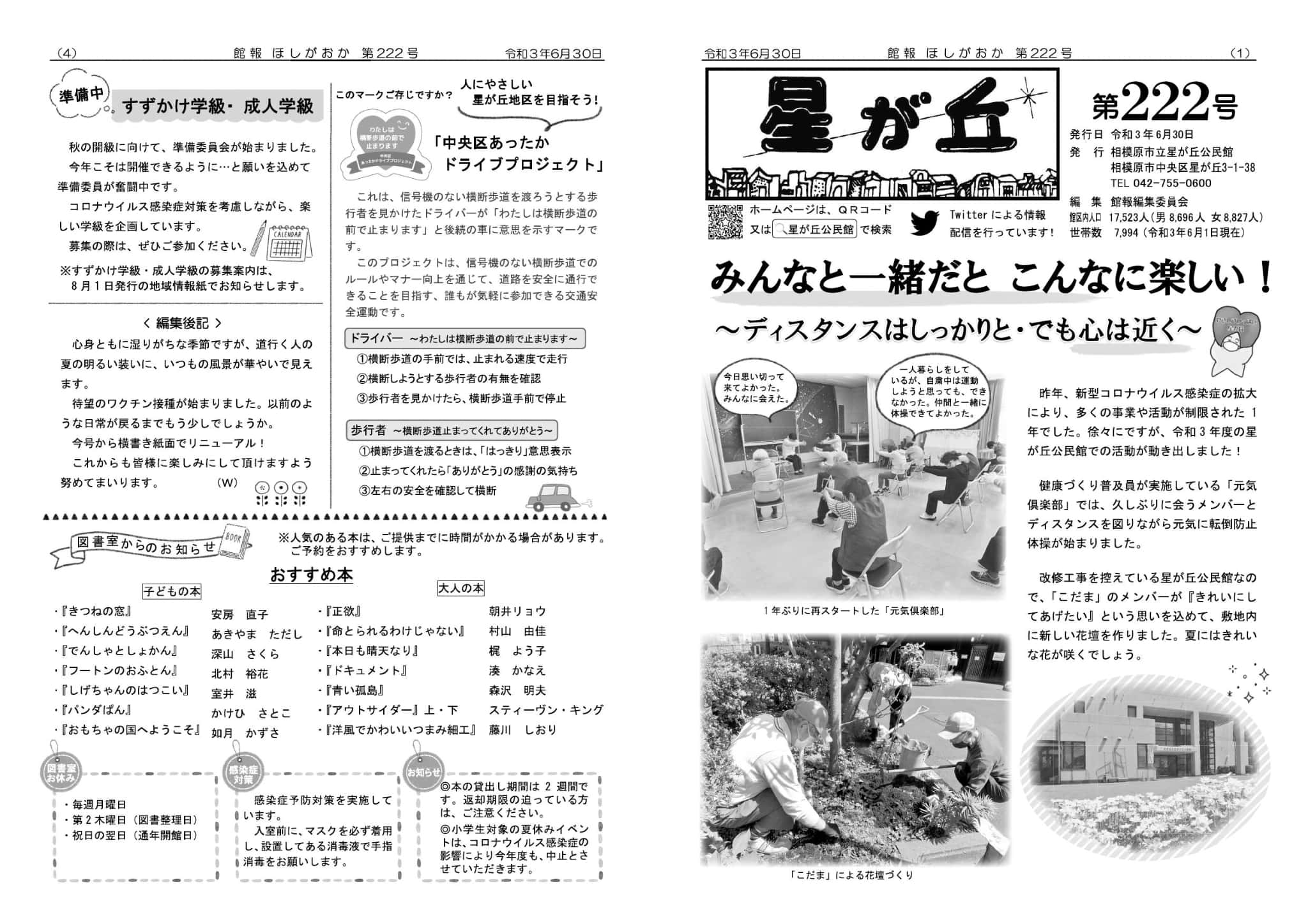 | ・みんなと一緒だとこんなに楽しい ~ディスタンスはしっかりと・でも心は近く~ ・雨で中止に 今年の健康ウォーキング ・館長のあいさつ ・令和3年度公民館を支える皆さん ・職員紹介 ・準備中 すずかけ学級・成人学級 ・中央区あったかドライブプロジェクト | |||