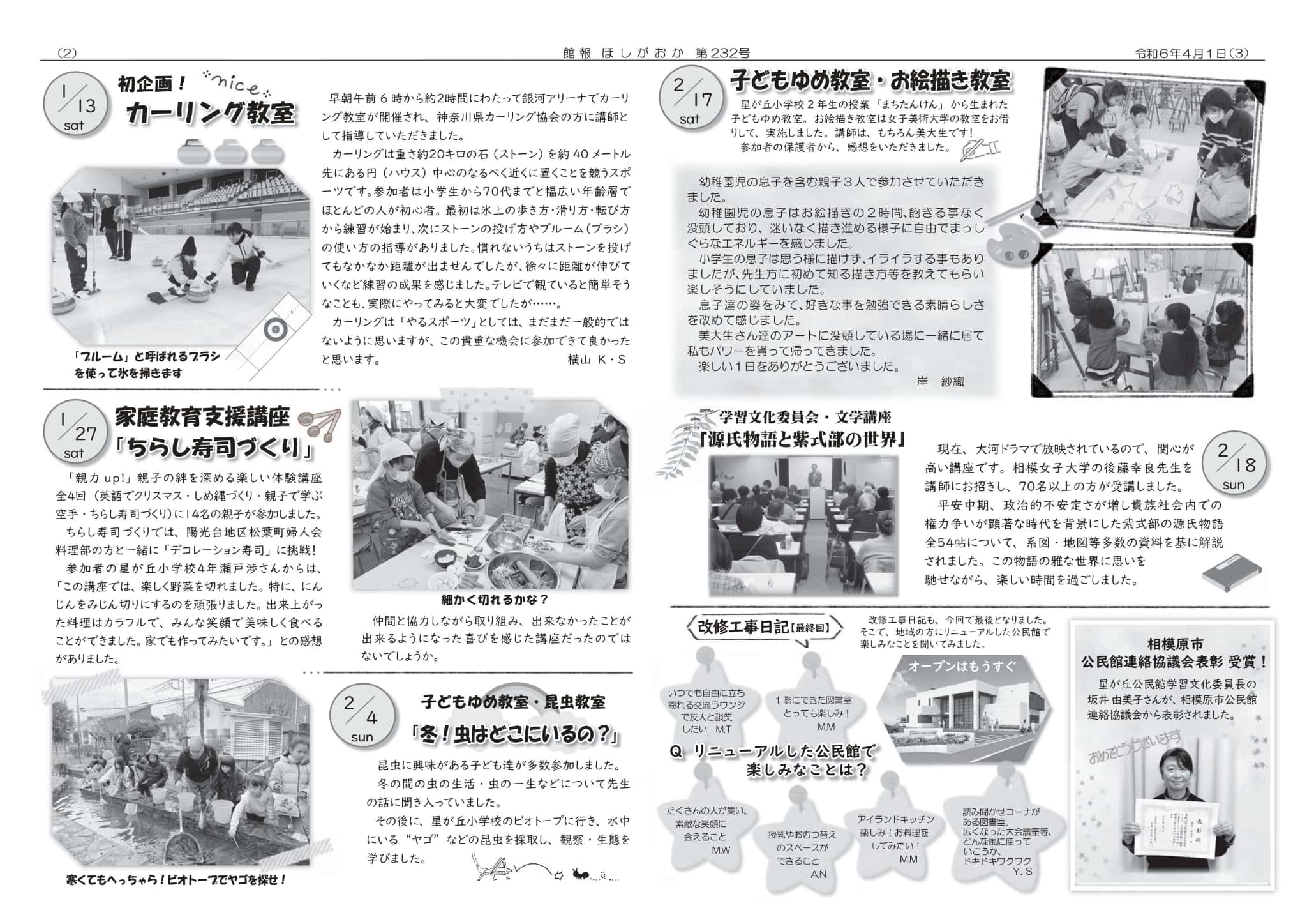 | ・事業結果報告 「いざという時に備える防災講座」 「カーリング教室」 「ちらし寿司づくり」 「冬!虫はどこにいるの?」 「子どもゆめ教室・お絵描き教室」」 「源氏物語と紫式部の世界」」 ・改修工事日記 ・公民館長あいさつ ・令和6年度星が丘公民館年間事業予定 ・編集後記 | |||