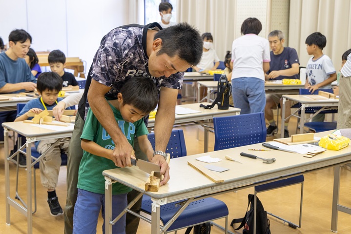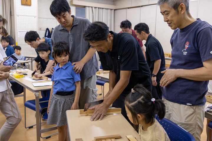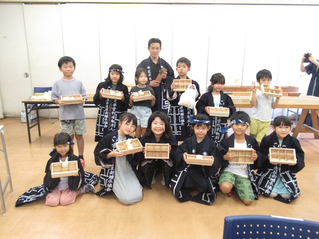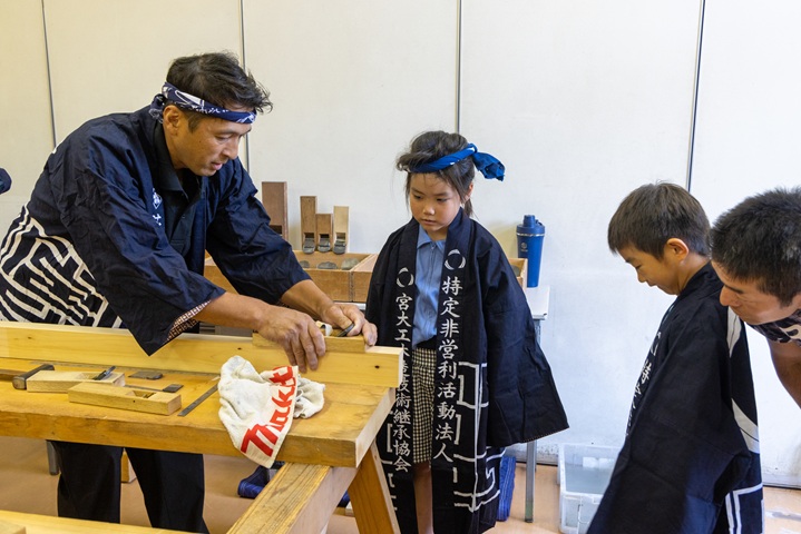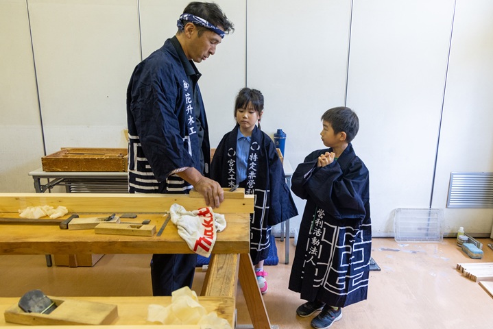 完成後は、宮大工体験。法被を着て、カンナ削りです。宮大工さんの匠の技を体験しました。