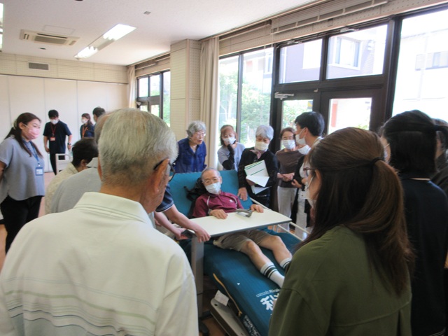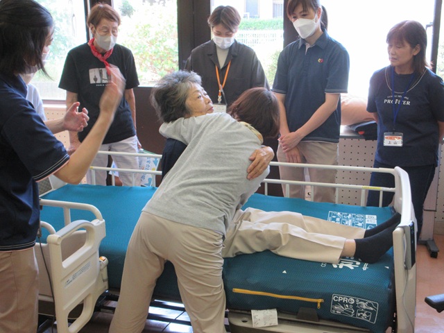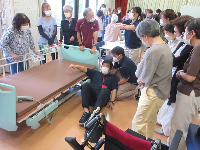 高齢者社会に対応した事業展開に向けて、地域包括支援センターと連携し、セントケアりまいん様の協力のもと福祉講座を開催しました。介護ベッドを利用するためのやり方、寝返りや車椅子への移乗、ベッドから落ちた時の対応などの介護のノウハウを、実際に体験しながら、介護のプロに都度質問しながら、学習することができました。