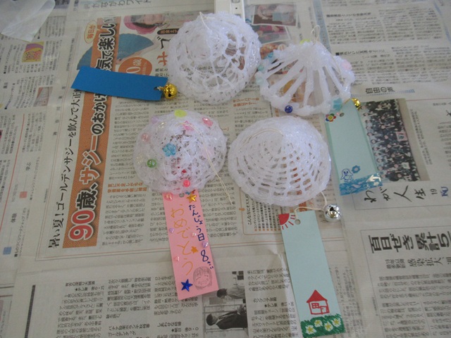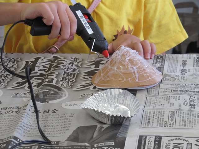 グルーガンを使った工作。グルーガンだけで形を作って、風鈴を作りました。