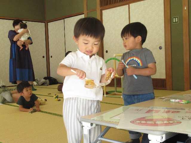 ![]() 歯のお話、虫歯菌がいるかのチェック、仕上げ磨きの仕方を教えてもらいました。 |