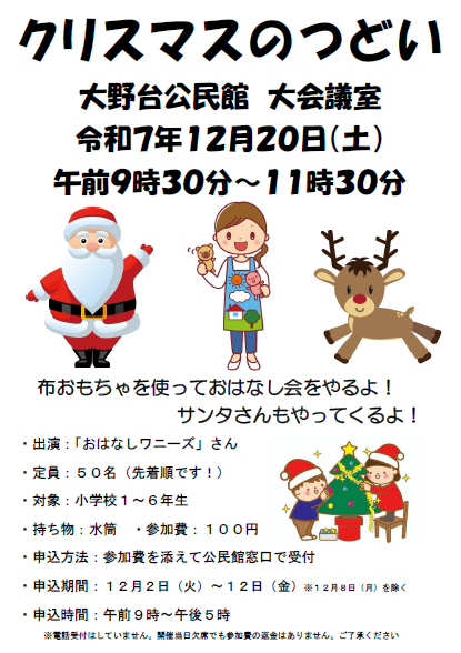 | 「クリスマスのつどい」 内容:楽しいクリスマスのつどいです。 日時:12月20日(土) 午前9時30分〜11時30分 場所:大野台公民館 大会議室 定員:50名(先着順) 持ち物:水筒 参加費:100円 申込み:参加費を添えて公民館窓口で受付 12月2日(火)〜12日(金)まで ※12月8日(月)を除く 午前9時〜午後5時 |