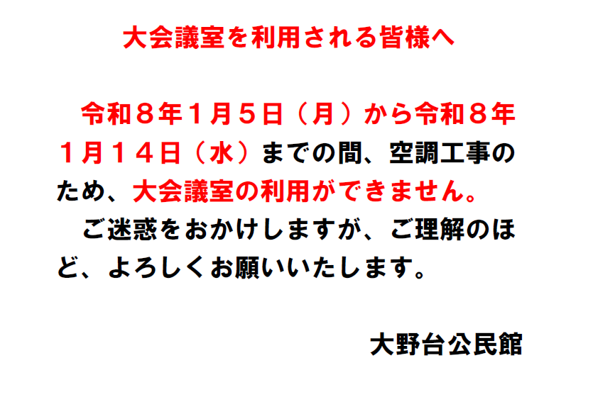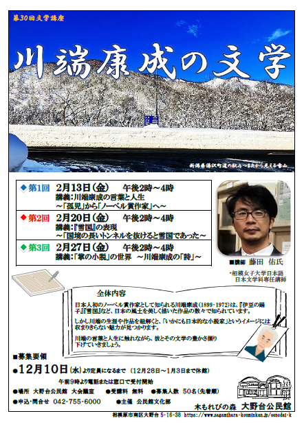 | 「文学講座」 内容:川端康成の文学。 日時:令和8年2月13日、20日、27日(金) 午後2時〜4時 場所:大野台公民館 大会議室 定員:50名(先着順) 申込み:12月10日(水)から定員になるまで (12月28日〜1月3日まで休館) ※電話または窓口で受付 |