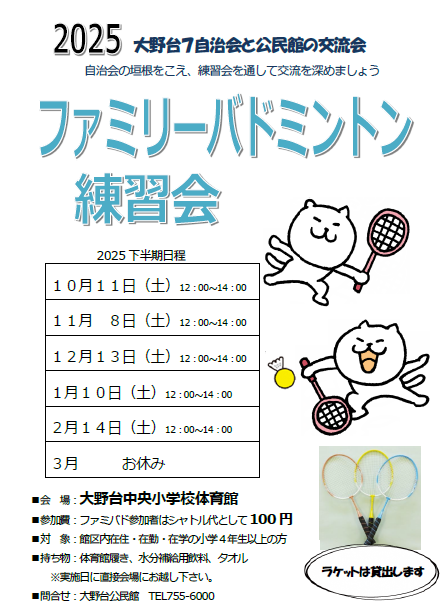 | 「大野台7自治会と公民館の交流会 ファミリーバドミントン練習会」 内容:ファミリーバドミントン練習会 日時:毎月第二土曜日 12:00〜14:00 ※R8年3月はおやすみ 場所:大野台中央小学校 体育館 参加費:100円(シャトル代) 直接会場へお越しください! |