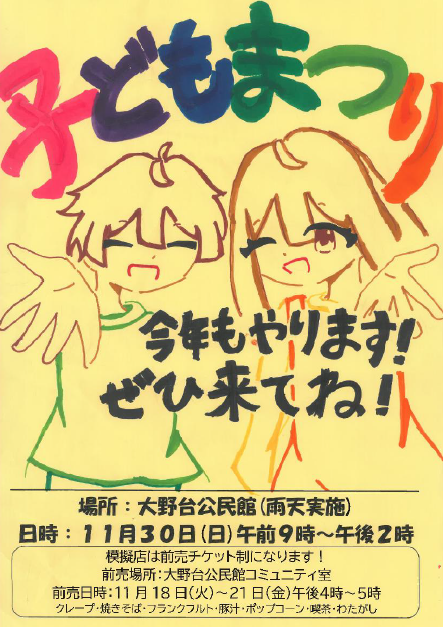 | 「子どもまつり」 内容:ゲーム、迷路、模擬店をやります。お待ちしてます! 日時:11月30日(日) 午前9:00〜午後2:00 場所:大野台公民館 模擬店は前売チケット制 前売場所:大野台公民館 コミュニティ室 前売日時:11月18日(火)〜21日(金) 午後4:00〜5:00 |