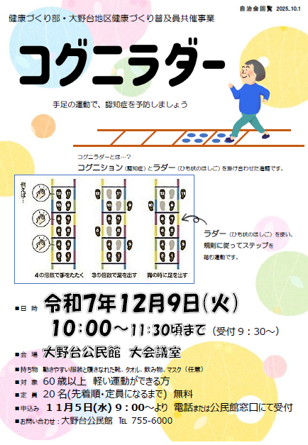 | 「コグニラダー」 内容:手足の運動で認知症を予防。 日時:12月9日(火) 10:00〜11:30 場所:大野台公民館 大会議室 定員:20名(先着順) 申込み:11月5日(水)9:00〜定員になるまで |