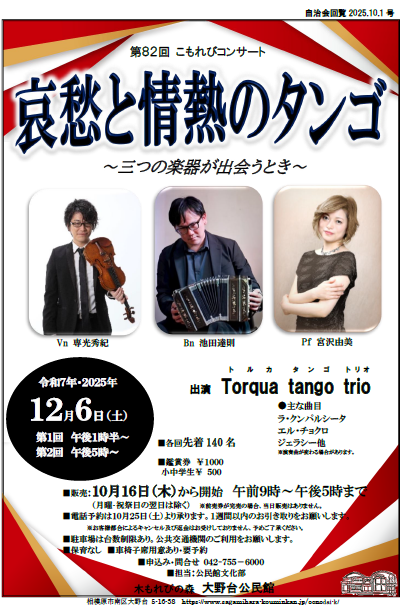 | 「哀愁と情熱のタンゴ」 内容:バンドネオン、ヴァイオリン、ピアノの演奏。 日時:12月6日(土) 第1回午後1:30〜 第2回午後5:00〜 場所:大野台公民館 大会議室 定員:各回140名(先着順) 鑑賞券:¥1000 小中学生¥500 申込み:10月16日(木)9:00〜定員になるまで ※電話予約は10月25日(土)から |
