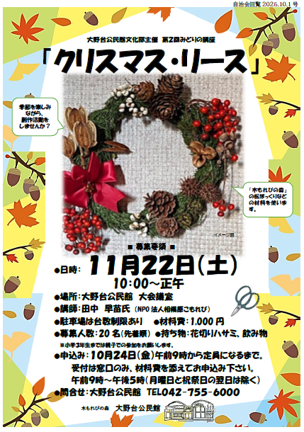 | 「クリスマスリース」 内容:こもれびの森の松ぼっくりなどの材料を使いリースを作る。 日時:11月22日(土) 10:00〜正午 場所:大野台公民館 大会議室 定員:20名(先着順) 材料費:1,000円 申込み:10月24日(金)9:00〜17:00定員になるまで ※受付は窓口のみ、材料費を添えて申込み 持ち物:花切りハサミ |