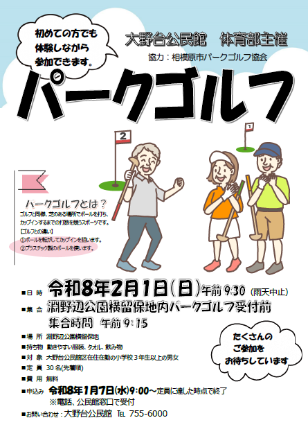 | 「パークゴルフ」 (雨天中止) 内容:パークゴルフを楽しみます。 日時:令和8年2月1日(日) 午前9時30分〜 場所:淵野辺公園横留保地 対象:大野台公民館区在住在勤の小学校3年生以上の男女 定員:30名(先着順) 申込み:令和8年1月7日(水)9:00〜定員になるまで ※電話、公民館窓口で受付 |