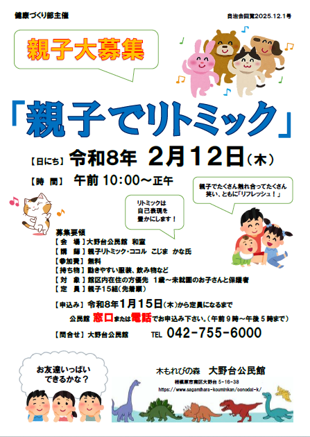 | 「親子でリトミック」 内容:親子でリトミック行います。 日時:令和8年2月12日(木) 午前10:00〜正午 場所:大野台公民館 和室 対象:館区内在住の方優先 1歳〜未就園のお子さんと保護者 定員:親子15組(先着順) 申込み:令和8年1月15日(木)から定員になるまで ※公民館窓口または電話で申込み(午前9時から午後5時まで) |