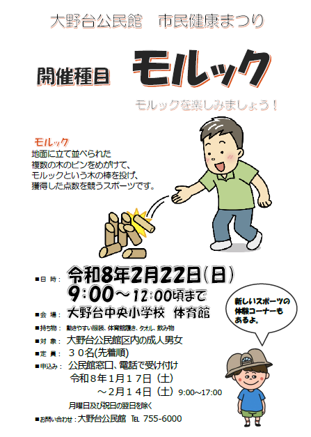 | 「大野台公民館 市民健康まつり」 内容:モルックを行います。 日時:令和8年2月22日(日) 9:00〜12:00頃まで 場所:大野台中央小学校 体育館 対象:大野台公民館区内の成人男女 定員:30名(先着順) 申込み:公民館窓口、電話で受付 令和8年1月17日(土)〜2月14日(土) 9:00〜17:00 月曜日及び祝日の翌日を除く |