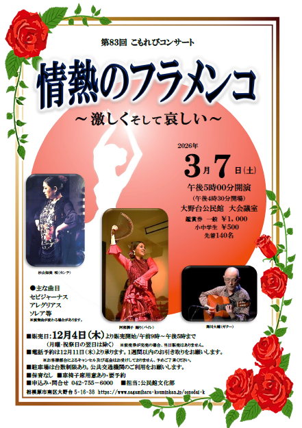 | 「こもれびコンサート」 内容:情熱のフラメンコ。 日時:令和8年3月7日(土) 午後5時開演 場所:大野台公民館 大会議室 定員:140名(先着順) 鑑賞券:¥1000 小中学生¥500 申込み:12月4日(木)午前9時〜午後5時 月曜・祝日の翌日は除く ※電話予約は12月11日(木)から |