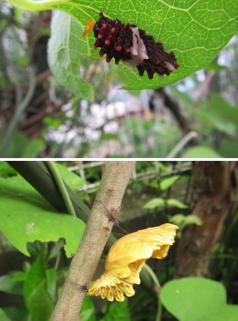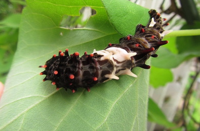 | もう梅雨が明けてしまいました。 6月中旬ころから、わが庭のオオバウマノスズクサに、 黒い幼虫がたくさん付いていました 調べてみましたら、ジャコウアゲハの幼虫でした。