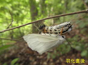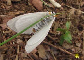 5月の後半、林の緑の道路で白い”蝶”がたくさん群れ飛んでいました。 よく見ると蝶ではなく蛾のような飛び方です。 その後、城山湖のハイキング道で、何度も遭遇しました。 正体は キアシドクガ(ドクガ科)で、 足が黄色いことから、名付けられたそうです。