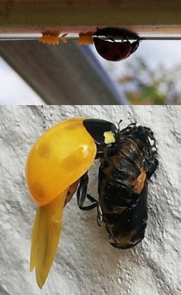 てんとう虫 卵と羽化の様子を撮影しました。 最初は黄色から黒点が出て… そのうち赤くなるかな?