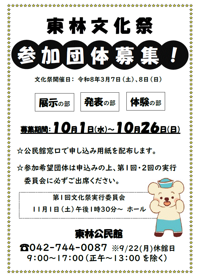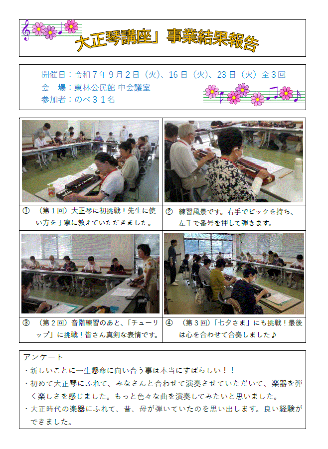 ![]() ・第3次東林公民館振興計画について ![]() ・当日の催行情報をこちらに掲示します ![]() ・参加団体募集10月1日(水)~ ![]() ・令和7年度事業一覧 R7年度事業の実施報告 「大正琴講座」の結果NEW 「ボッチャ大会」の結果 「こども社会見学」の結果 「ライブを楽しもう!S。O。S」の結果 「ボッチャ講習会①」の結果 「俳句講座」の結果 「ファミリーバドミントン講習会①」の結果 「親子ふるさとうどんづくり」の結果 ![]() 2025年4月1日:「館長のご挨拶」を掲載 2025年10月1日:「新着図書」を掲載NEW |