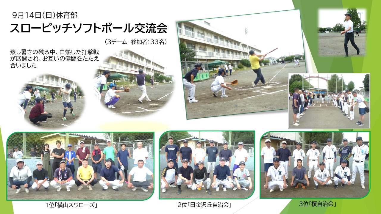 5月19日(日)に自治会対抗スローピッチソフトボール大会が開催されました。参加2チームによる白熱した試合が展開され、結果、9対6で優勝は自治会法人榎自治会、2位は日金沢丘自治会となりました。 |