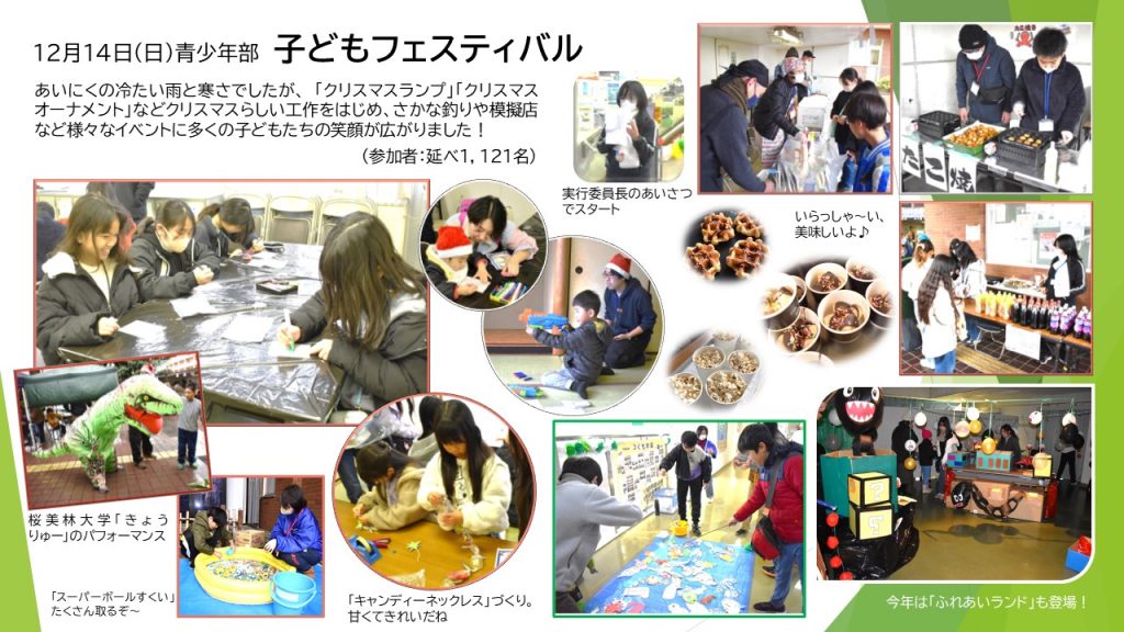 12月14日(日)「よこやま子どもフェスティバル」が開催されました。当日はあいにくの雨でしたが、大勢の子どもたちが遊びに来てくれ、工作やゲーム、模擬店などで大変盛り上がっていて、公民館全体がにぎやかで楽しい雰囲気に包まれた子どもフェスティバルになりました。