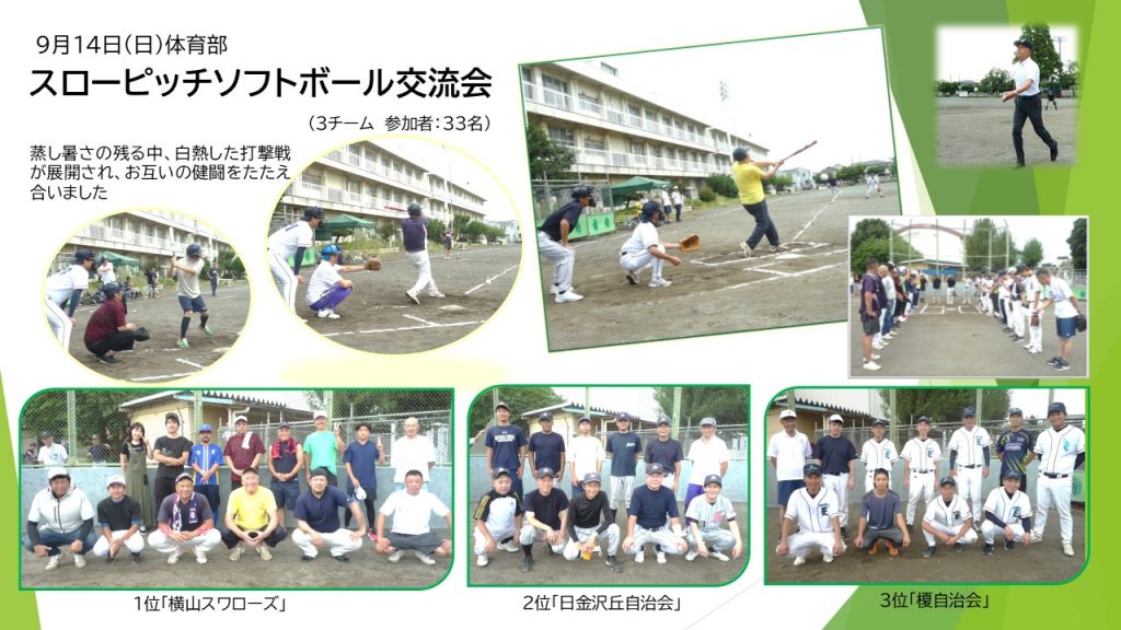 前日の雨も止み多少の蒸し暑さが残る中、白熱した打撃戦が展開され、1位が「横山スワローズ」、2位が「日金沢丘自治会」、3位が「榎自治会」。試合後、選手ら参加者はお互いの健闘を称え合い満足そうな笑顔で帰路につきました。