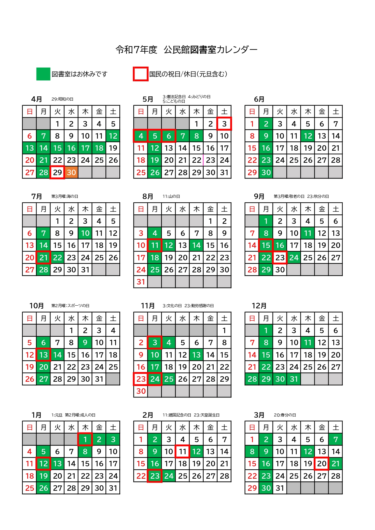 令和7年度の休館日