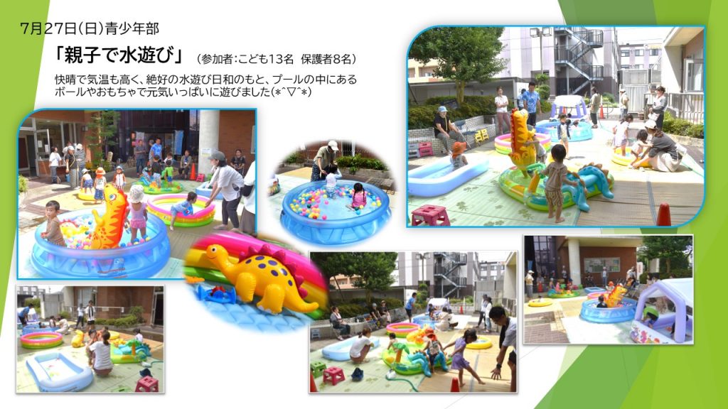 7月27日(日)横山公民館青少年部による「親子水遊び」が開催されました。今年も朝から快晴で気温も高く、絶好の水遊び日和となりました。小さなこどもたちはプールの中にあるボールやおもちゃで元気いっぱいに遊んで、笑顔にあふれた可愛らしい光景が広がっていました。