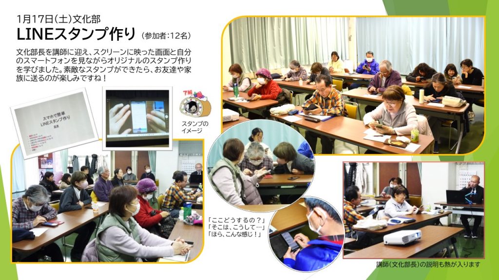 1月17日(土)文化部事業「スマホで簡単 LINEスタンプ作り」を開催しました。小田島文化部長が講師を務めてくださり、丁寧にわかりやすくご指導いただきました。参加者のみなさんも使い方を習得し、それぞれ個性のあるスタンプ作りに役立てて楽しんでもらえたらと思います。
