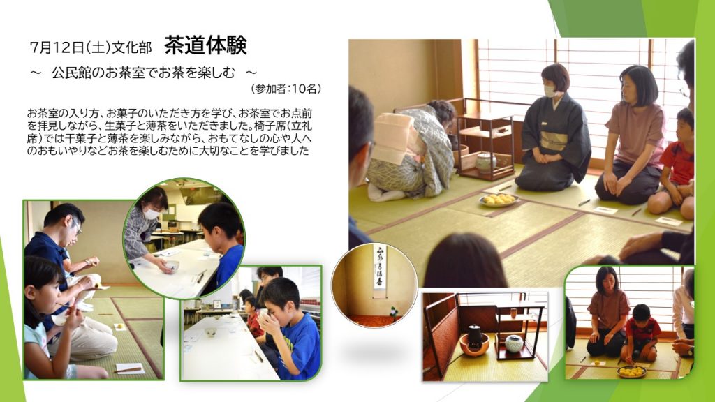 緊張した雰囲気を味わいながら、茶道の作法や礼儀、感謝やおもてなしの心を学びました。老若男女幅広い世代交流の事業となり、有意義な土曜のひとときを過ごすことが出来ました。これからも”おもてなし”の心を大切にしていきたいですね!
